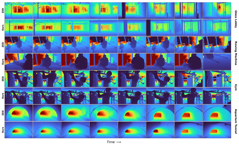 实验中,奥比中光 Gemini 330 系列在应用 LingBot-Depth 后,面对透明玻璃、高反光镜面、强逆光及复杂曲面等极具挑战的光学场景时,输出的深度图依然平滑、完整,且物体的轮廓边缘非常锐利,其效果显著优于业内领先的 3D 视觉公司 Stereolabs 推出的 ZED Stereo Depth 深度相机。这意味着在不更换传感器硬件的前提下,LingBot-Depth 可显著提升消费级深度相机对高难物体的处理效果。