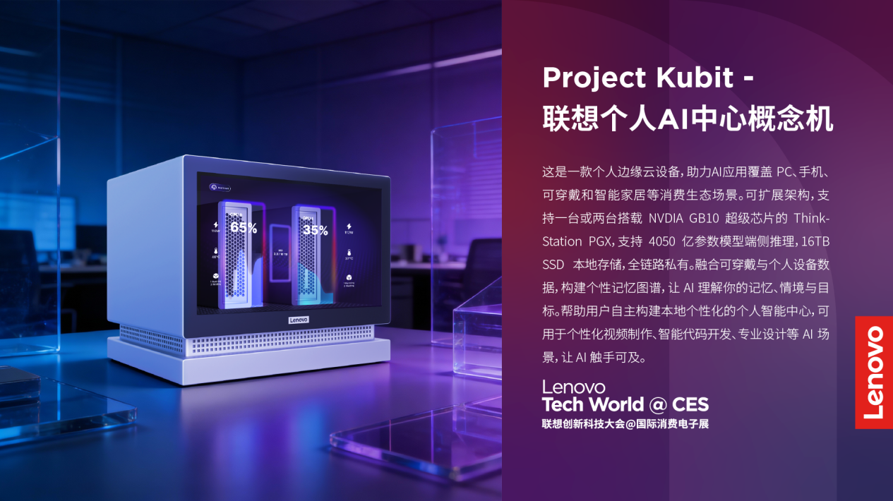 据了解,Project Kubit 可扩展架构,支持一台或两台搭载 NVDIA GB10 超级芯片的 ThinkStation PGX,支持 4050 亿参数模型端侧推理,16TB SSD 本地存储,且全链路私有。