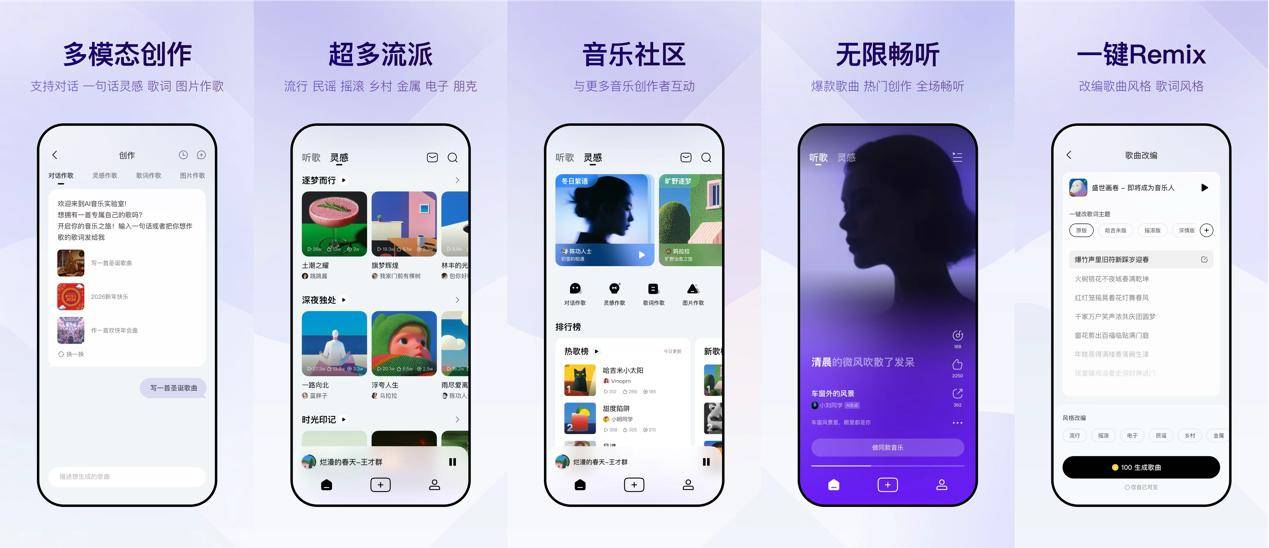 产品还内置AI音乐社区,支持作品分享、热歌排行、内容畅听等功能,主打“人人可参与、可分享展示”的互动属性,让创作成果能直接转化为社交展示。
