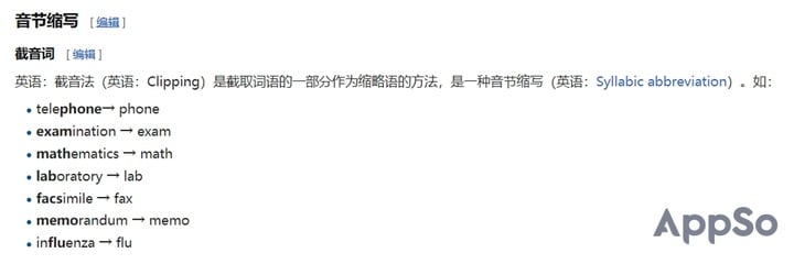 让我们来看看有道词典是怎么发音的,显然,[æp] 是正确发音。如果想深入了解为什么是读 [æp] 而不是「A-P-P」,我们可以参阅维基百科。维基百科中将将缩写分为音素缩写、拼写简化、音节缩写等。而「app」属于音节缩写,其他常见的音节缩写词还有 exam、math、lab等,想想你读「lab」会读成「L-A-B」吗?