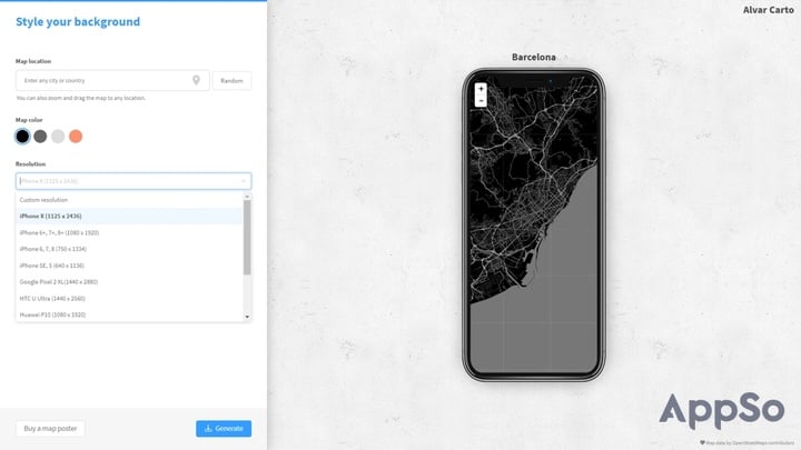 使用《Alvar Carto》提供的线上地图壁纸制作功能,就能轻松将你的家乡或地球上任何一个角落做成绝美的壁纸。《Alvar Carto》提供四种颜色搭配,分别为黑色、灰色、白色和橙色,但不支持自主配色。同时还可针对设备选择壁纸的分辨率,如 iPhone X (1125×2436)、Samsung Galaxy S8 (1440×2960),当然,也支持自定义分辨率。
