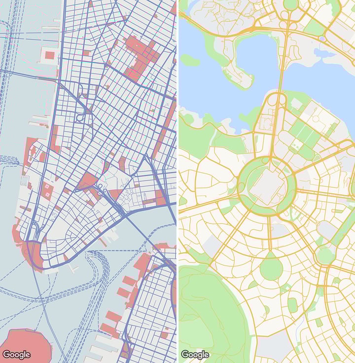 地图是自然景观和人文景观的美妙结合,人类的建筑总是会受到地形或地势的影响,因而产生许多绝美的作品。俯瞰一个地区的平面图,细细品味地图上的独特线条,你会发现杂乱有时候也是一种美。