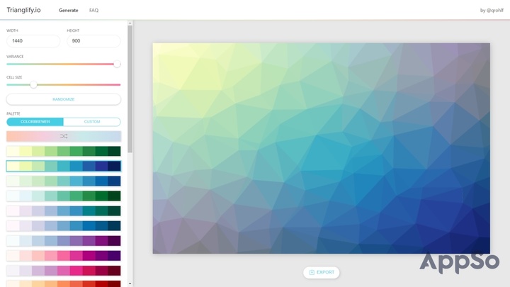 《Trianglify》可以帮你在网页上快速制作低多边形风格的壁纸,而且可定制化程度较高。首先可以调节壁纸的分辨率,然后选择随机化程度和晶胞大小。接下来就是最重要的颜色搭配了,同样《Trianglify》提供了多种颜色方案,对于配色困难户可直接选用内置方案,但如果你想自己配色也是支持的。