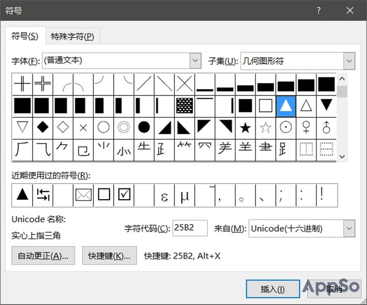 Word 有着自己的特殊字符库,而且每个特殊字符都有自己的快捷键,但一般都是字符代码+「Alt+X」。以「▲」为例,首先输入「25B2」,再按下「Alt+X」,刚才的「25B2」就会自动变为「▲」了。但我们也可以更改为更加方便的快捷键,比如我写本篇文章的时候就作了如下的快捷键更改。