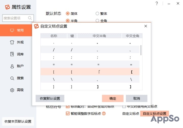 第三方输入法也有类似的设置,以「搜狗拼音」为例,除了和「微软拼音」一样的自定义短语外,还有一种更为极端的「自定义标点」,即将现有标点直接替换为特殊字符。比如作了如下设置,输入 【 便会变为输入「,但对于常用的符号,还是不要自定义了。