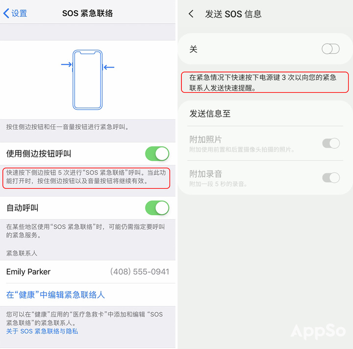 紧急情况下,发送 SOS 信息需要做到悄无声息,掩歹徒耳目。那么自然不能通过屏幕进行操作,这时候手机实体键的能力便体现出来了,一只手就能悄悄地开启 SOS 模式。当然,需要提前在手机上设置好,不同手机的触发方式也不尽相同,如 iPhone 为快速按五次侧边键,而三星手机只需点按三次。
