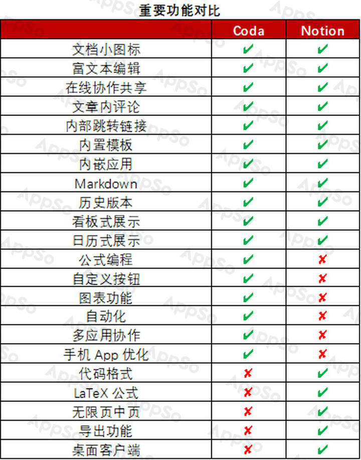 与《Coda》类似,《Notion》同样是以功能大而全著称。两者在笔记记录、待办事项、文档协作等云文档功能方面并无太大差别。两者均可在文章中进行评论,均有内置模板,均可进行 Markdown 编辑,均可内部跳转链接等等。两者主要功能对比可见下图。