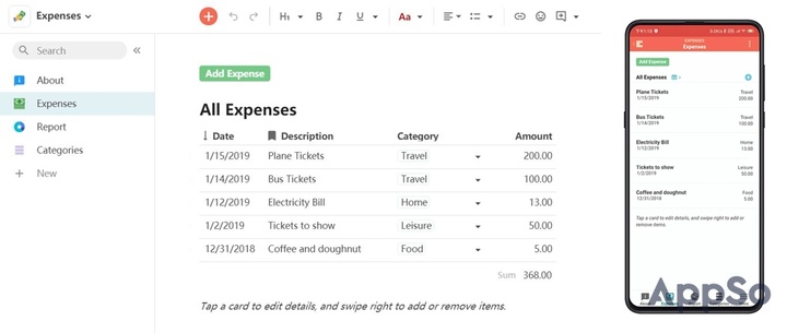 以内置的记账模板为例。日常生活中,我们总是习惯使用手机进行记账,而使用电脑进行消费数据分析。而《Coda》让两者完美地同步了,在移动端,我们以手机的输入方式记录消费,同时查看一段时间内的汇总扇形图;在网页端,每一笔记录都被放入了一张表格,使得所有数据一目了然。