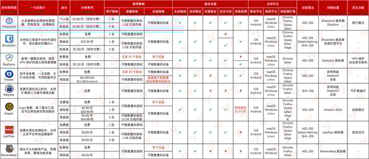 作为一个密码管理软件,不应该只有一个保存密码的功能,还应具备自动填充或生成随机密码的基本功能。因此,Excel 或备忘录记录密码、微信或支付宝内置小程序都只能算是密码存储方式,并不能完成自动化的工作。以下挑选大家常用的几款密码管理软件进行对比,干货都在下面这张表里了。