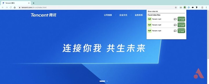 以腾讯首页的展示视频为例,这里它作为背景显示在文字下方,不可右键保存,而通过扩展则可以直接抓取到下载地址进行下载。同理,微博上的视频也可以同样进行保存。