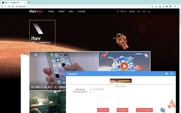 Copyfish 便是一款用于网页文字识别的扩展,一般只要文字背景不过于复杂,即可正确识别。比如图中的「爱范儿,让未来触手可及」,其中「爱范儿」的背景过于复杂,则没有识别为文字,而后面的文字则被正确识别出来了。识别后的文字可以进行复制,或进入 Google 翻译进行翻译。