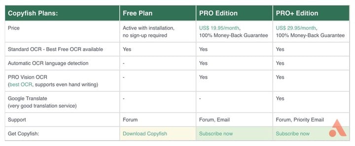 另外,Copyfish 还提供 PRO 和 PRO+ 版本,价格分别为 19.95 美元/月和 29.95 美元/月。增加了 OCR 语言自动识别和 PRO Vision OCR,即更好的 OCR 识别技术,甚至手写体也能很好识别。如果你想识别本地图片或 PDF 文件,将其使用 Chrome 打开即可使用 Copyfish 进行识别。