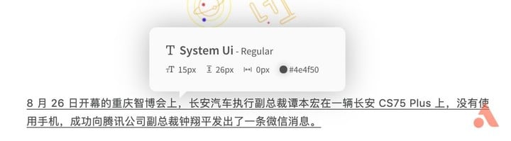 单独选中某段文字还可以显示单独的字体名和段落信息,包括字号、行间距、字间距和文字色号。对于从事文章排版的人来说具有一定的参考意义,比如看到了某篇微信推送,觉得排版很好看,就可以用浏览器打开,然后查看其字号和行间距等信息了。