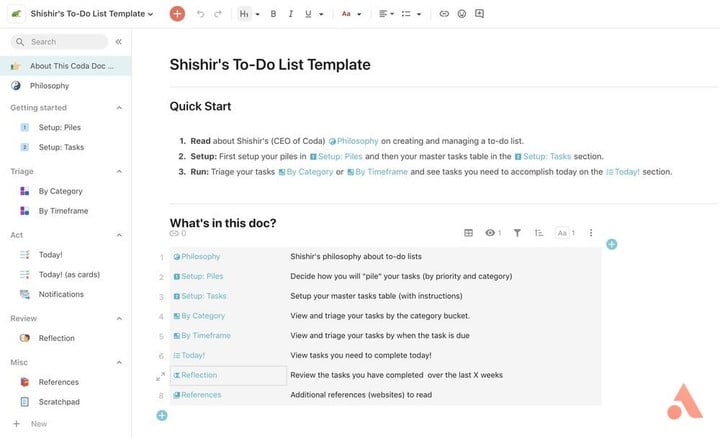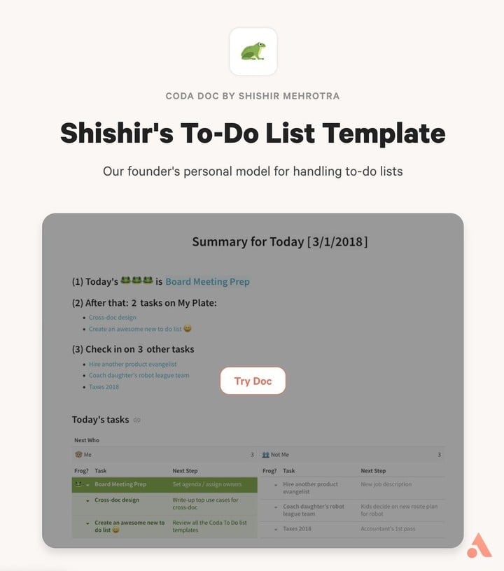 当然,在介绍如何自己制作 app 前,我们可以看看现有的模板。我特地询问了 CEO 有什么好的模板可以推荐,于是他便推荐了自用的 To-Do List。我们可以在 Coda 的模板库中找到「Shishir’s To-Do List Template」,以此创建文档便可以使用了。