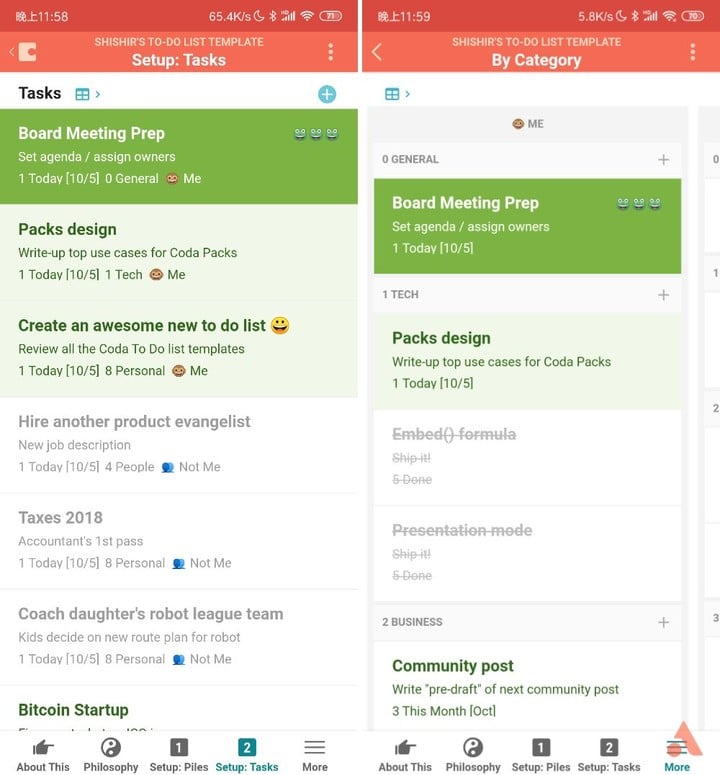 另外就是本文的重点了,使用 Coda 制作的 To-Do List 的最大的优势是可以建立任意的手机版视图模式,比如你习惯以任务类别查看任务,那就可以将其以单独的 tab 直接放入导航栏中。总而言之,这是属于你自己的 app,一切都在自己的掌握中。