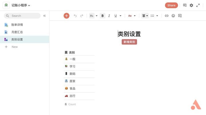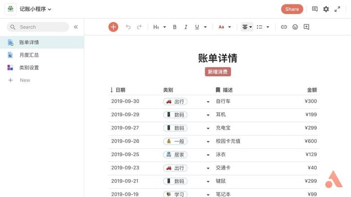 记账软件本质上是一个数据库,我们将每天花费的数额、时间等信息记录下来,然后从不同角度对其进行分析比较,从而指导下一步的消费。在 Coda 中的体现便是新建一张数据表,每一行代表着一笔消费,每一列代表着消费的各种信息。