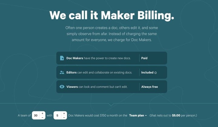 基于以上角色定位,我们再来看一下收费模式。上文提到的付费价格仅为在工作区添加一位 Doc Maker 的价格,而每位 Doc Maker 又可以拥有几位免费的 Editors,比如专业版每位 Doc Maker 可以拥有 2 位 Editors,而团队版可以拥有 5 位。如此一来,针对不同团队对不同角色的不同需求将会使收费变得十分复杂,建议使用自带的计算器进行价格分析比较。
