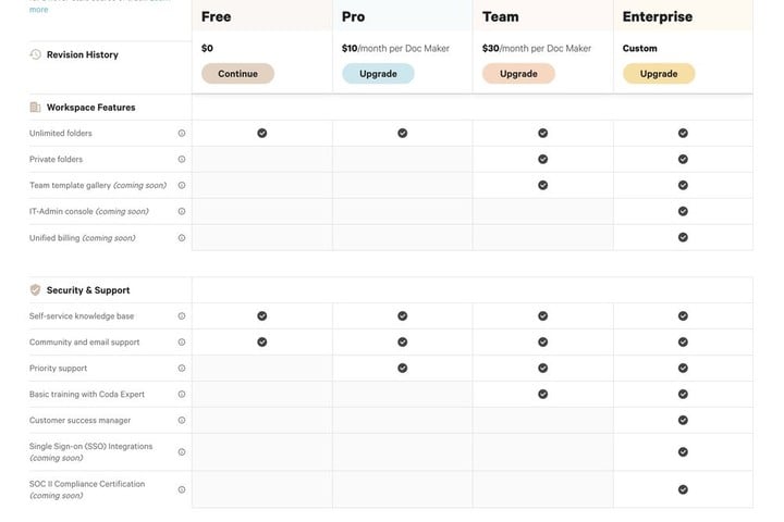 但也不用太过担心,Coda 的基础功能还是可以免费使用的,如果你只是个人用户,那么免费功能便绰绰有余,但如果你有着几十人的小团队,那么免费功能可能就不够用了。而本次更新的「收费模式」也恰恰是为了将个人与团队的需求进行区分,让 Coda 能更好得帮你进行团队协作。