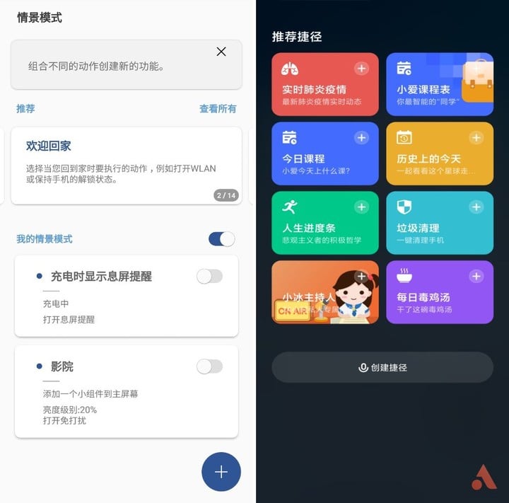 iPhone 的捷径功能可谓十分强大,许多复杂的操作让我们一键解决,但随着 Android 系统的不断进步,许多厂商也逐渐加入了简单的捷径功能。比如三星的情景模式,同样可以设定一连串动作自动完成;小米的捷径功能,也提供了类似的自动化操作。