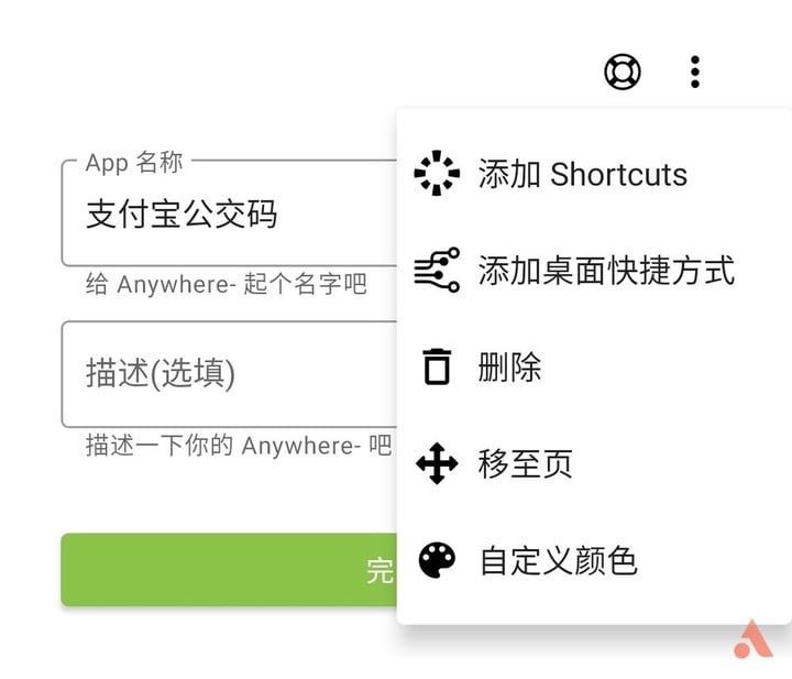 创建后的 Anywhere 卡片会被收集到一起,并且还贴心地提供分页功能。但这样的启动方式似乎并没有达到我的预想效果,如果能在不打开应用的情况下直接启动就更好了。而《Anywhere-》恰恰做到了而且做得非常好,它提供了三种额外的启动方式——浮动图标、Shortcuts、桌面快捷方式,让你觉得捷径简直无处不在。