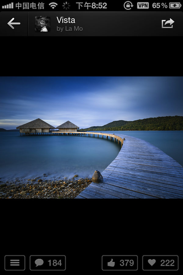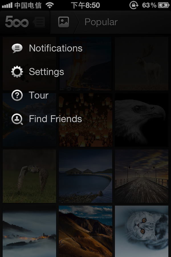 从用户界面上看,它没有任何冗余的元素。淡雅的灰黑配色,顺滑的过渡动画,雅致的弹出菜单,再配上精彩绝伦的各种照片——相信我,这绝对是一种享受。