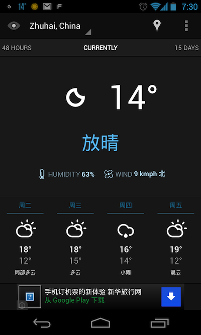 它的界面设计是我们钟爱的 Holo 风格。而它简单直白的天气状况图标(开发者还另外提供了 11 套图标供选择)、大字号的气温和天气状况,让我们在打开应用的那一刻就了解到最需要的信息。此外它还提供了湿度、风力、风向等即时天气资讯,在第一屏你还能看到五天内的天气预报。