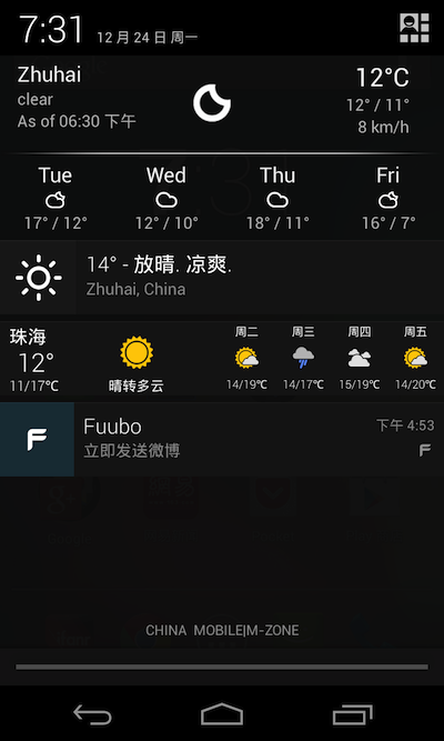 如果你只想要一个简单的插件,在通知抽屉里放入天气预报,可以试试 Notification Weather。这是一款精致实用的小插件,值得推荐。效果见下图: