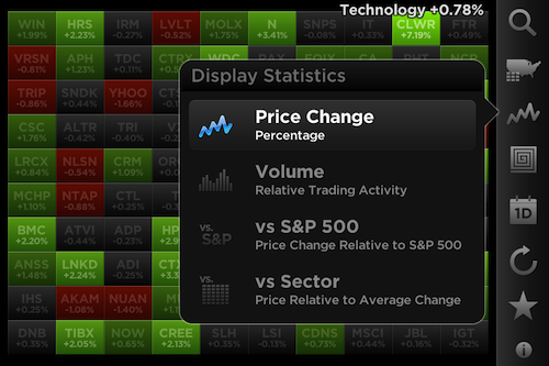 这个时候要如何分析大盘?在右侧的操作栏上,StockTouch 提供了视觉分析的选项,而已依照价格的变化、换手率、与 S&P 500(特别指美国的故事)指数相比、与平均水平相比进行分析。