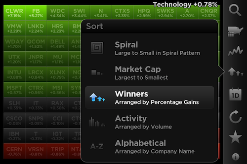 股票价格的涨跌,StockTouch 会用不同的颜色来表示:绿色表示涨、红色表示跌、灰色表示变化不大。如果变化幅度越大,那么每只股票颜色会变得愈加鲜艳。