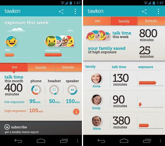简而言之,Tawkon 的工作原理就是通过手机数据来判断用户辐射吸收量,并提出一些建议。这些数据源包括网络类型、网络运营商、频段、信号强度、手机信号等等。