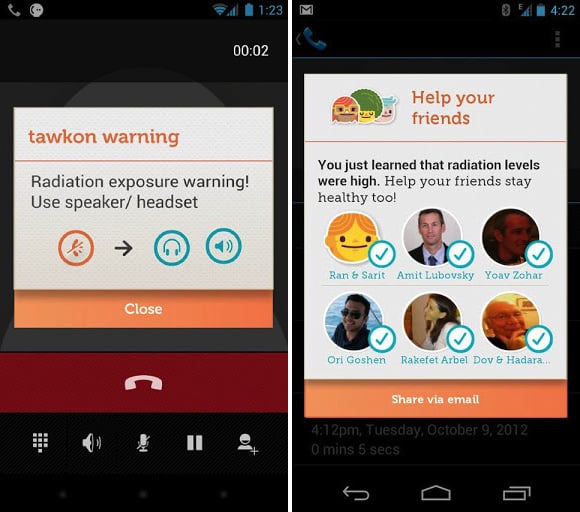 在待机或通话状态,Tawkon 就开始实时监测,当辐射水平较高时,Tawkon 便会提出一些防范建议,比如与手机保持一定的距离,使用蓝牙耳机通话等。