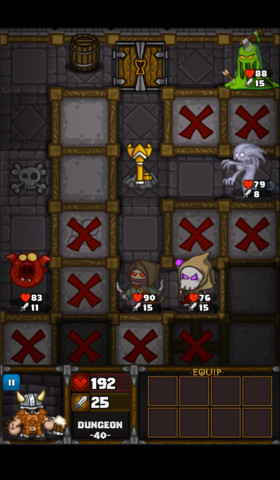 和“扫雷”一样,Dungelot 开始进行游戏的时候,玩家需要一个个将棋盘上的方块消除,不过一不小心就会将骷髅兵、蝙蝠等怪物给“扫”出来,这个时候,玩家所扮演的英雄需要将这些怪物打倒才能继续将方块消除,找到那把过关用的“金钥匙”。