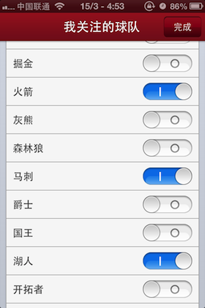 第一次打开应用,虎扑看球助手会让我们挑选自己关注的球队,从一开始过滤掉大部分自己不需要的信息。
