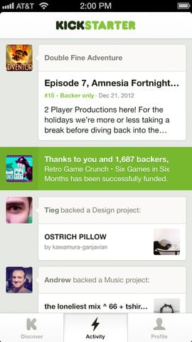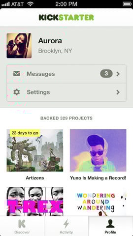 Kickstarter 客户端的导航很是明晰——三个标签:Discover、Activity、Profile,分别对应“项目”、“社交”、“个人”三大模块。