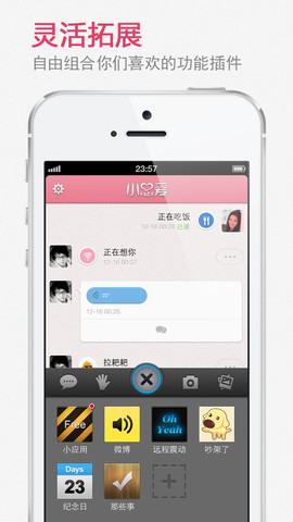 小恩爱除了基本的聊天、状态、相册等功能,最值得一提的就是情侣闹钟以及插件的设计。