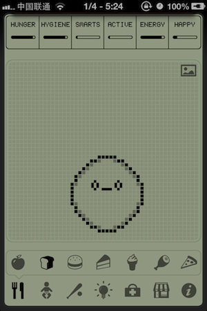 Hatchi 界面简单,上方提示了宠物的状态,有健康度、活跃度、能量等等,下方则是我们抚养宠物的动作,吃东西、玩皮球等等,玩法也简单,只要满足宠物的需求就可以了。