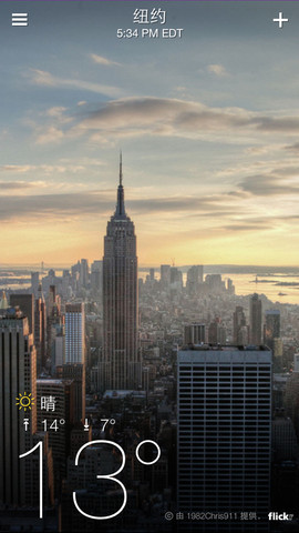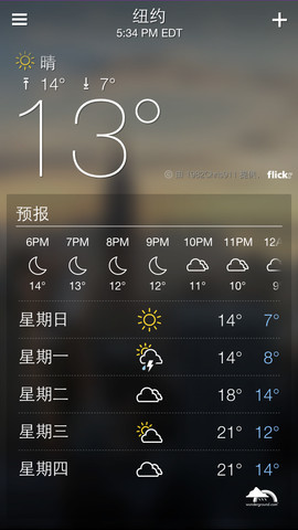 Yahoo! Weather 里选用的 Flickr 背景图都是选用了在所选城市拍摄的图片,横屏即可看到完整的照片(如题图)。如果无法找到符合条件的图片,App 会根据天气情况统一配图。