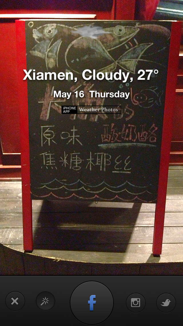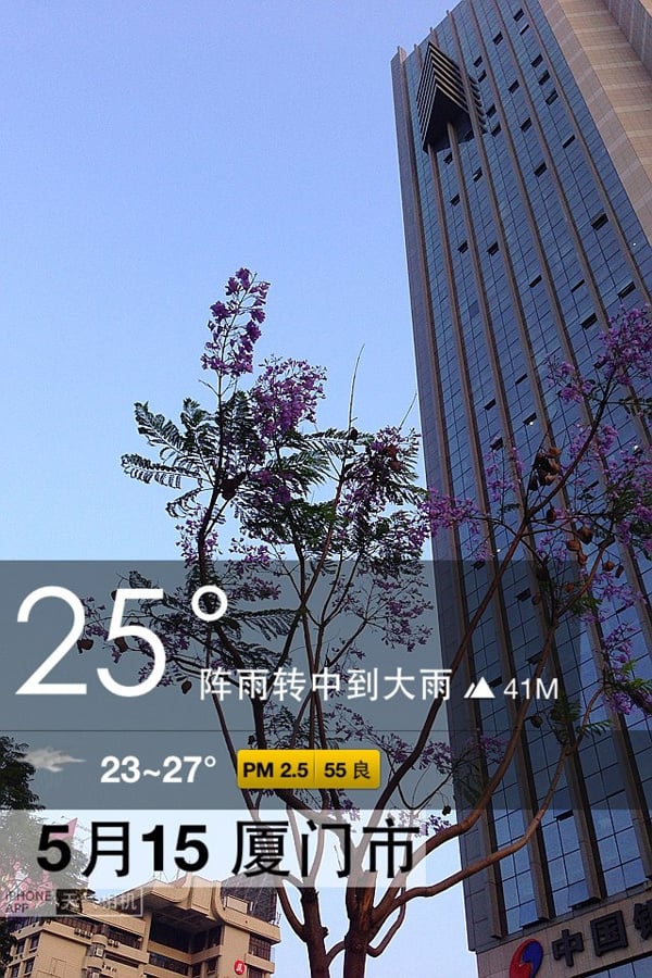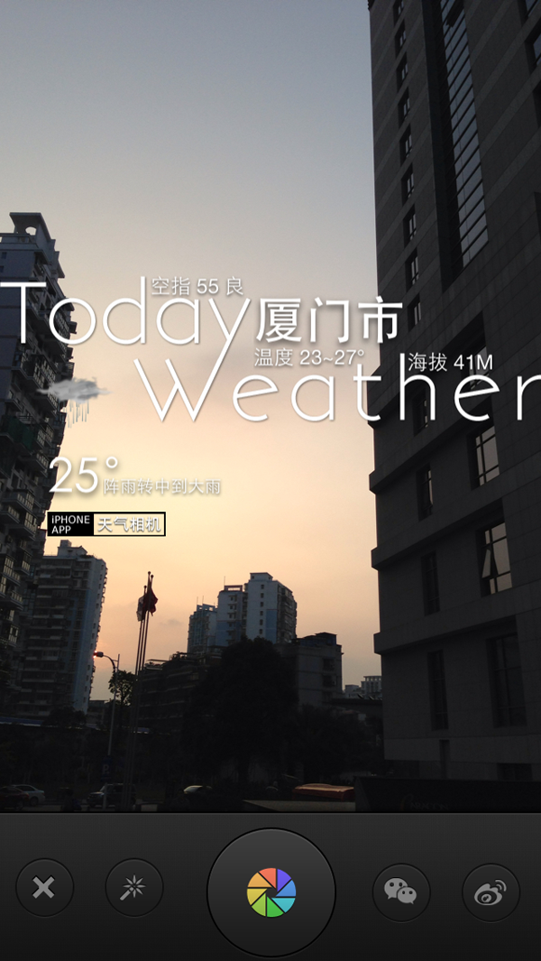 好了,简单好玩的天气相机介绍完了。相信你也已经看到厦门的 PM2.5 值为傲人的 55 了吧?这个时候,我就应该用天气相机,拍张美景图,发给我北京的同事,得瑟得瑟……^_^
