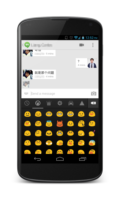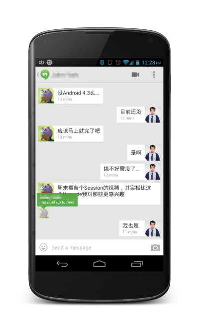 下图是 Hangouts 的聊天界面。如你所见,对话是以头像 + 对话框的形式出现的,感觉比 Talk 的对话列表要美观和直观。翻动对话列表的时候,新载入的对话会有飞入效果,非常漂亮。对话框下面显示的头像是那个人的阅读进度,可以很方便的确认朋友有没有看到你的消息。在多人环聊的模式下,这个阅读进度的头像经常会不断跳动非常漂亮。这个头像同时也会显示输入状态 (以三个跃动的小点标识)。