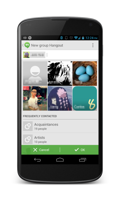我们不用很麻烦很累就能开始聊天。除了传统的输入联系人姓名 / 邮箱 / 电话号码来进入聊天之外,Hangouts 提供了六个最常用联系人的头像,还有群组。Hangouts 支持一次和一个群组展开群聊!选择完了联系人,就可以进行聊天了。