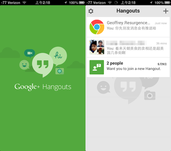 和 Android 版本不同,iOS 版的 Hangouts 有个很漂亮的启动画面。之后就是最近对话界面了,对话列表的空白处还能看到精美的背景图。其他界面和 Android 版本并没有什么区别。功能方面,iOS 版 Hangouts 不能发送表情,也没有右滑返回的手势操作……期待 Hangouts 的下一次更新能够添加这两个功能。
