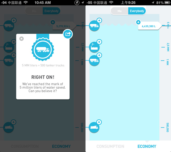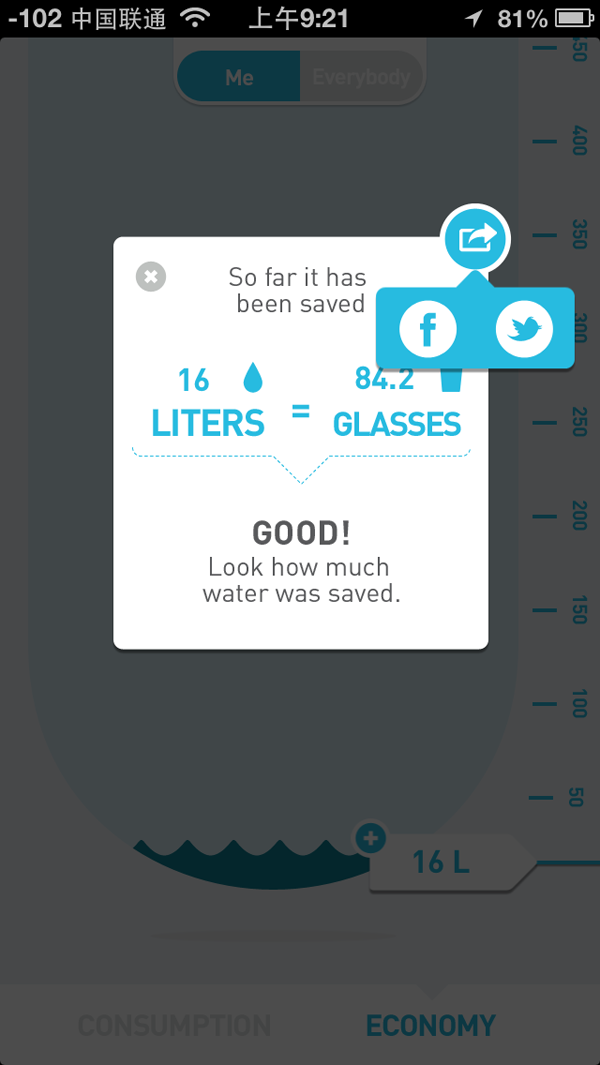 每次使用后还会得到一个节水数据,不断累加。我目前是 16L,相当于 84.2 杯水。如果你愿意,你还可以把这个数据分享到 Facebook 和 Twitter 上。