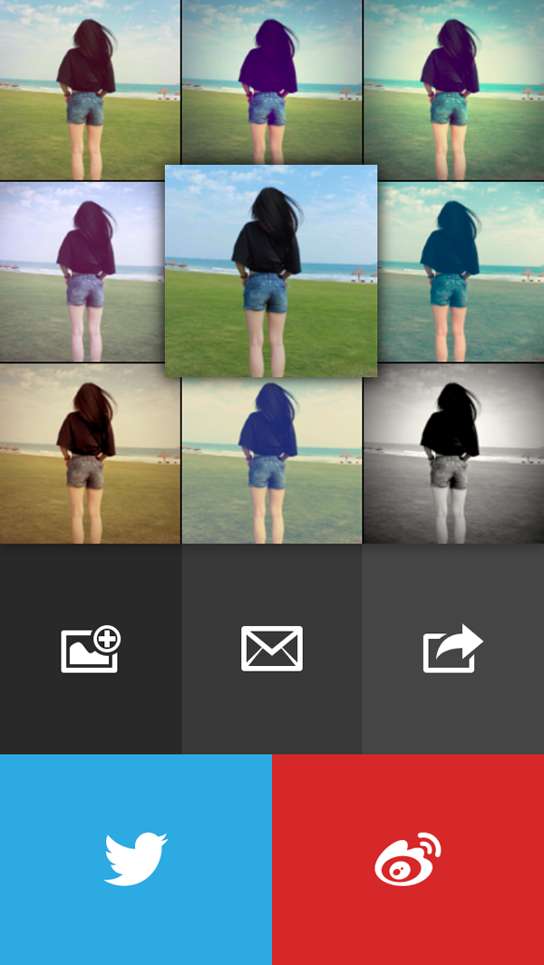 拍照,美化之后要干嘛?有人喜欢“私藏”,有人喜欢分享。而这两个动作,你同样可以在同一个界面一键完成。看到那个大大的新浪微博 Logo 了吧?Analog Camera 说不定会成为微博控的神器。