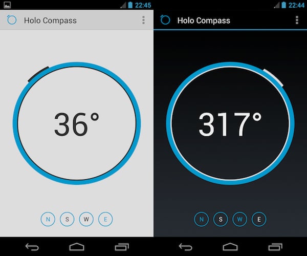 App 本身就是极致到底的简洁。两种 Holo Theme,清新的配色,以及大字号的角度指示。