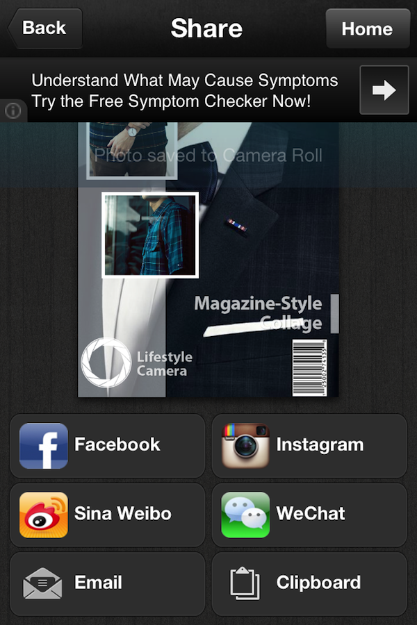 当然,这广告条并不影响我们做出漂亮的图片。既然漂亮难免要显摆一下,你可以将做好的杂志封面图分享到微博、微信或是 Instagram 里去。