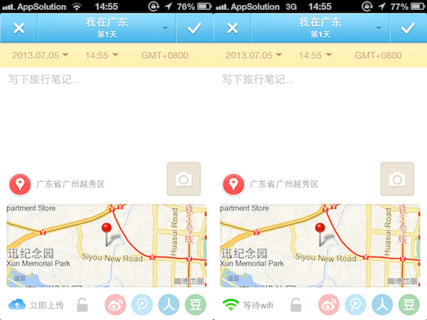 值得一提的还有“离线编写”功能——如果你使用的是 WIFI 网络,在路上会默认“立即上传”游记;如果是移动网络,你可以将模式切换为“等待 WIFI”,节省流量很重要啊!