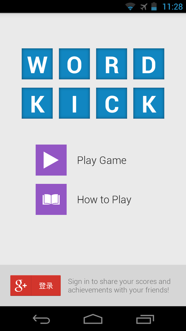 Wordkick 的欢迎界面非常简单,提供开始游戏以及查看帮助两个选项。不同的是,Wordkick 是为数不多的已集成 Google Play Game Services 的游戏之一,用 Google+ 账号登录之后,即可与好友共享分数和成就。虽然这一功能目前实用价值还不大,但着实为简单的游戏增色不少。