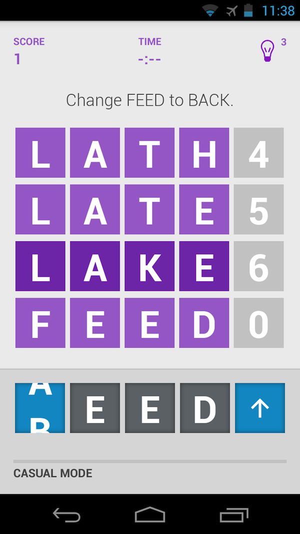 Wordkick 之所以不同,是因为它不再要求玩家从一大堆乱七八糟的字母里挑出单词,而是将一个四字单词,通过尽可能少的步骤,变成另一个四字单词。每一步只能改变单词中的一个字,而改变每个字母后,必须同样构成一个完整的单词。