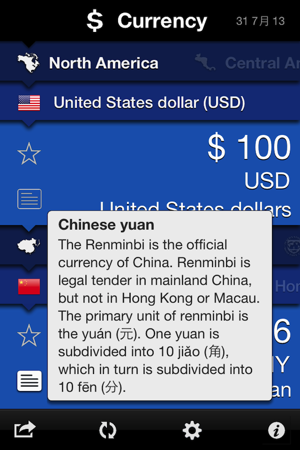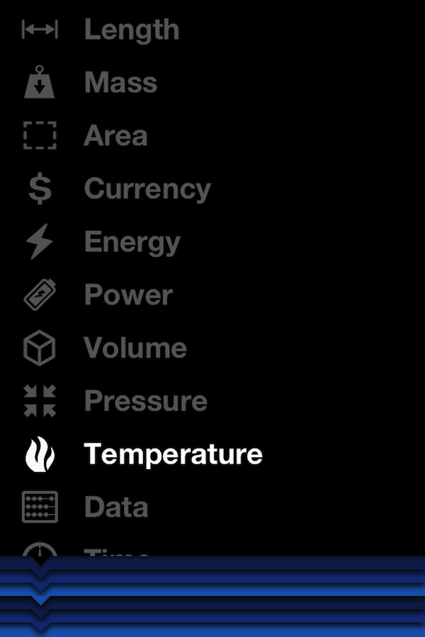 打开 Convertible,最顶部会弹出所有计量单位。其中,长度、面积、体积、温度、压强、数据容量、实时更新的货币应有尽有。选择需要的单位后,屏幕下方层叠的面板就会依次展开。