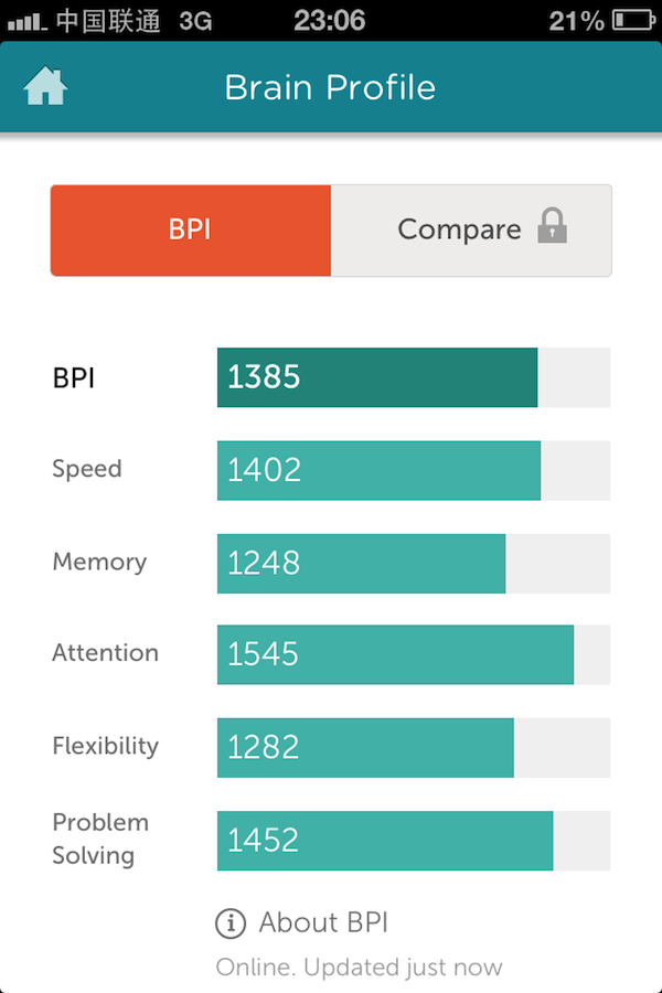 完成每天的训练任务之后,Lumosity 会以漂亮的图案进行提示,同时,可在「我的大脑档案」中查看自己的训练成果,包含 BPI 指数及各项能力值。